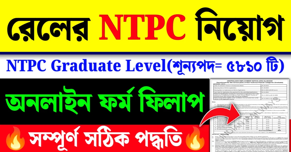 Railway Recruitment Board অর্থাৎ RRB বোর্ডের তরফ থেকে NTPC (Non Technical Popular Categories) Graduate Level এর জন্য নোটিফিকেশন প্রকাশ করা হয়েছে। এখানে মোট শূন্যপদ রয়েছে ৫৮১০ টি। যার জন্য আজ থেকে অর্থাৎ ২১ শে অক্টোবর থেকে আবেদন শুরু হয়েছে। আবেদন চলবে ২০ নভেম্বর ২০২৫ তারিখ পর্যন্ত।