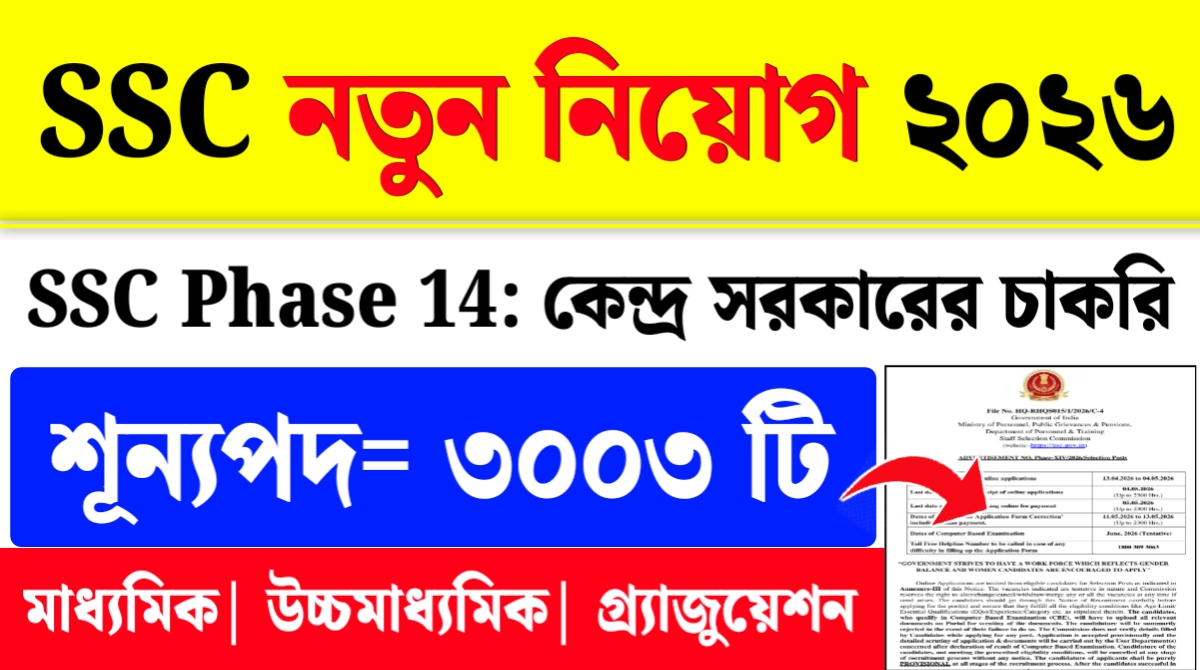 সমস্ত চাকরিপ্রার্থীদের জন্য দারুন খুশির খবর। এখন বর্তমানে SSC বোর্ডের তরফ থেকে Phase 14 এর জন্য ৩০০৩ টি শূন্যপদে নতুন নিয়োগের বিজ্ঞপ্তি প্রকাশ করা হয়েছে ভিন্ন ভিন্ন পোষ্টে। যেখানে মাধ্যমিক, উচ্চমাধ্যমিক ও গ্রাজুয়েশন পাশ যোগ্যতায় আবেদন করা যাবে। আবেদন শুরু হয়েছে ১৩ ই এপ্রিল ২০২৬ তারিখ থেকে এবং আবেদন চলবে আগামী ৪ই মে ২০২৬ তারিখ পর্যন্ত। আজকের এই পোষ্টের মাধ্যমে এই নোটিশ সংক্রান্ত বিস্তারিত তথ্য নিয়ে আলোচনা করা হবে তাই শেষ পর্যন্ত পোস্টটি পড়ুন।