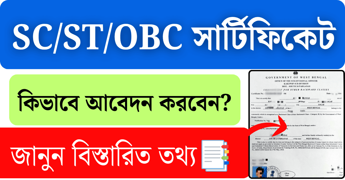 পশ্চিমবঙ্গে SC/ST/OBC কাস্ট সার্টিফিকেট অনলাইন আবেদন করার সম্পূর্ণ পদ্ধতি, প্রয়োজনীয় ডকুমেন্ট ও স্ট্যাটাস চেকের নিয়ম এখানে জানুন।