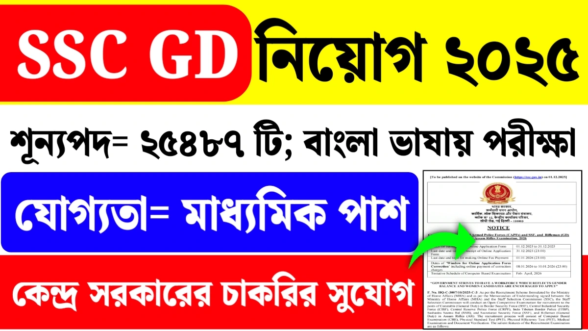 ২৫৪৮৭ টি শূন্যপদে কেন্দ্র সরকারের চাকরির সুযোগ, SSC GD Constable Notification Out. নতুন নোটিশ অনুযায়ী বিস্তারিত তথ্য জানুন