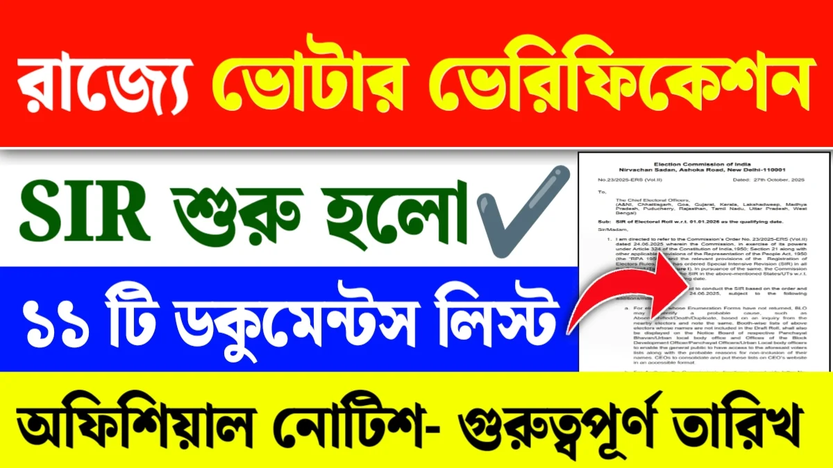 নির্বাচন কমিশন (ECI) ২৭ অক্টোবর ২০২৫ তারিখে নতুন নির্দেশিকা প্রকাশ করেছে যেখানে ২০২৫-২৬ সালের জন্য SIR – Special Intensive Revision ঘোষণা করা হয়েছে। যার মধ্যে আমাদের পশ্চিমবঙ্গ ভোটার ভেরিফিকেশন ও শুরু হবে। এই প্রক্রিয়ায় পশ্চিমবঙ্গসহ দেশের বিভিন্ন রাজ্যে ভোটার তালিকা প্রকাশ করা হবে। আগামী বিধানসভা ভোটকে কেন্দ্র করে শুরু করা হচ্ছে এই ভোটার ভেরিফিকেশন প্রক্রিয়া। রাজ্যের মধ্যে যে সমস্ত নাগরিকদের ভোটার কার্ড রয়েছে তাদের প্রত্যেককে এই ভোটার ভেরিফিকেশন করতে হবে।
