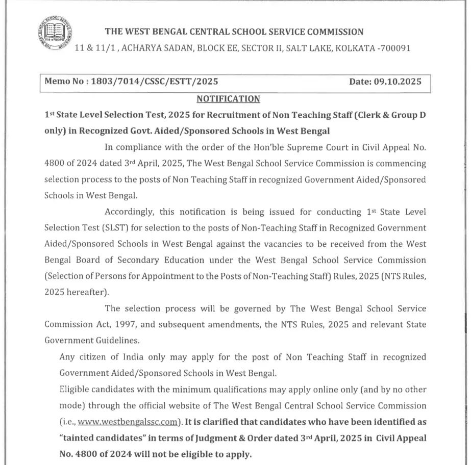 WBSSC অর্থাৎ West Bengal Central School Service Commission এর তরফে Group C and D Notification প্রকাশ করা হয়েছে(1st SLST 2025)। যার জন্য রাজ্যের ছেলে এবং মেয়েরা অনলাইন আবেদন করতে পারবে। এখানে মোট দুটি পোস্ট রাখা হয়েছে। একটি Group C অর্থাৎ ক্লার্ক পোস্ট এবং Group D পোস্ট। WBSSC Group C and D Notification অনুযায়ী এখানে মোট শূন্যপদ রয়েছে ৮৪৭৭ টি। যেখানে Group C পোস্টে ২৯৮৯ টি এবং Group D পোস্টে ৫৪৮৮ টি।